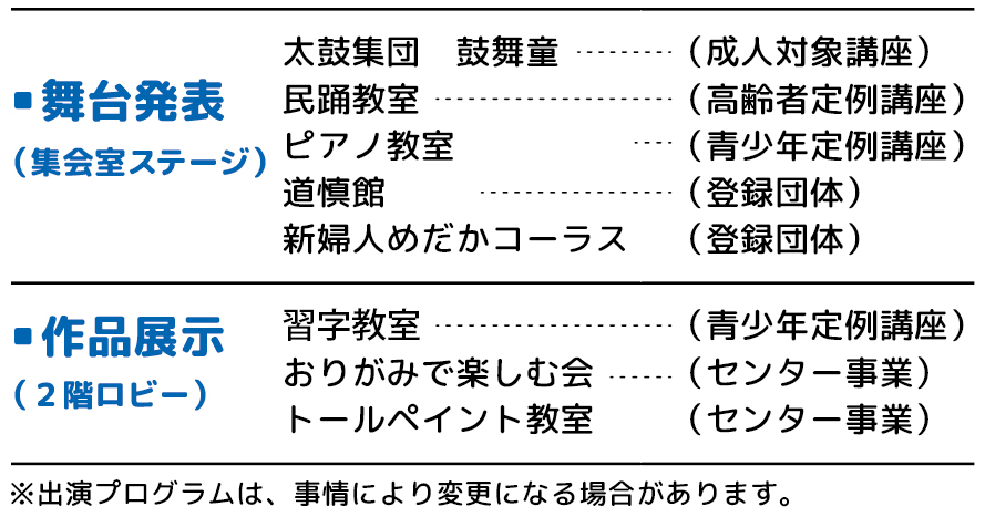 | 令和6年度 講座発表会 3月22日 センターの講座受講生や活動団体が日々の練習の成果を発表しました! |