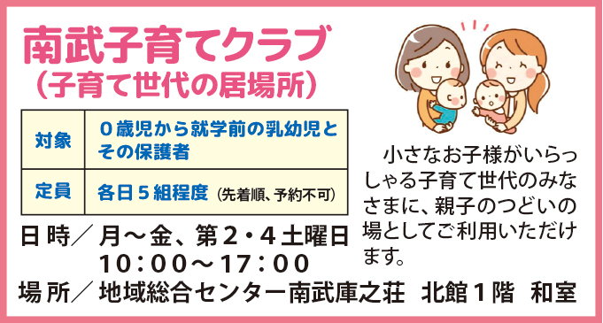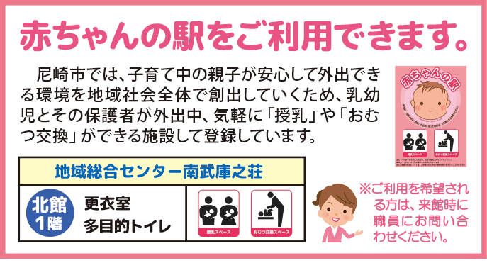 | 「南武子育てクラブ」は、子育て世代の親子のつどいの場です。 | 「赤ちゃんの駅」のご案内は、尼崎市のホームページでも紹介されています。 |