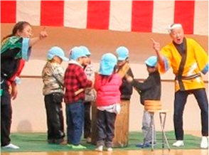 保育園のこどもたちと地域の高齢者がふれあう交流の場です。マジックショーや園児たちの歌、一緒になっての踊りや手遊びなどで盛り上がり、園児からのプレゼントもありました。 |