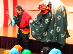 「寿獅子」と三味線、太鼓、歌のお囃子に乗せておもちをつきあげる「もちつきばやし」を、民族歌舞団 花こまのみなさまに披露していただきます。