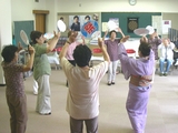 認知症予防を目的とした運動プログラムです。全身を動かす運動と計算やしりとり等頭を動かす問題を同時に行うことで脳と身体の機能を向上させる取り組みです。頭と身体を使って楽しく認知症予防に取り組みました。 |