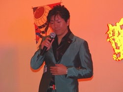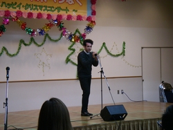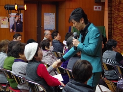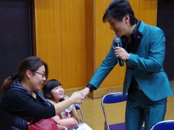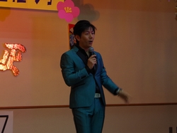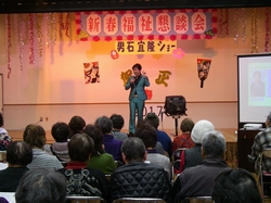 今年もまた新春福祉懇談会に、演歌歌手の男石宜隆さんをお招きしました。 曲作りに絡んだ京都や島根、そして台湾での数々のエピソードを軽妙に語っていただき、会場は新春から笑いに包まれ、心地よい温かさで満たされました。 平成28年9月21日に発売された待望のメジャーデビュー曲「大阪泣かせ雨」では、会場のみなさんが曲に合わせて「のぶちゃんコール」を贈るなど終始大盛り上がり。 初めて男石さんを間近に見たという参加者が多かった今回も、男石さんの甘いマスクと透き通った高音の歌声に魅了されて、新たにファンになる人が増えたようでした。